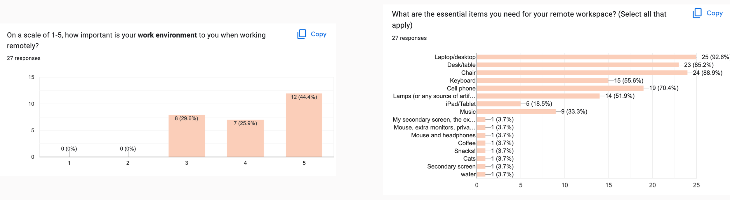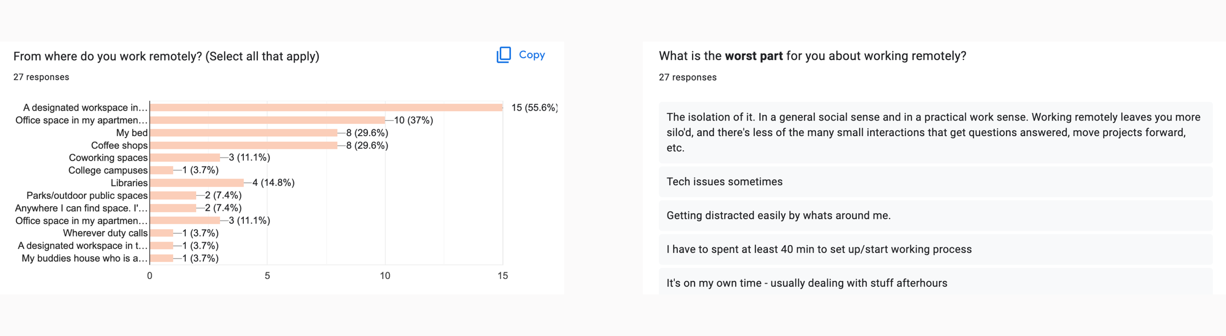 My survey targets to gather evidence about remote work life to inform user interface decisions. What do remote workers consider essential workspace items? What are their feelings about remote work? Where do they work the most? I survey 25+ remote workers to use qualitative and quantitative data to answer these questions.
